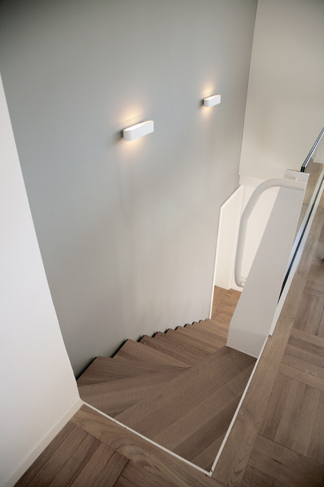 Ziel dieser Sanierung war die Zusammenlegung der 2 unteren Wohneinheiten. Die Betondecke wurde an geeigneter Stelle aufgesägt, ein individuelles Treppenmöbel bildet die neue interne Verbindung der beiden Wohnungen. Zudem wurde das angrenzende Erdreich im Untergeschoss hangseitig abgetragen, die Brüstungen entfernt, sodass in diesen bereichen luftigere Öffnungen und eine Nebeneingangstür realisiert werden konnte. Der abgetragene Teil ermöglicht eine großzügige Terasse mit Weitblick über Tübingen.